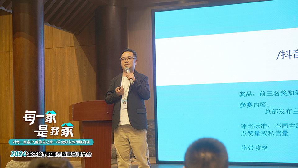 荃芬總部王策從需求的角度分析:消費降級帶來的主要影響是,消費會從較高的需求層次向“生命健康、安全”的基礎(chǔ)需求坍縮,即消費者會減少在奢侈品等精神享受層面的消費,最大化保留在安全健康層面的消費,而除甲醛,正是屬于安全健康的需求——這也是近兩年建材行業(yè)從業(yè)者大批跨界進入除甲醛行業(yè)的原因。同時用數(shù)據(jù)論證了市場空間之大,“我們就像一條海魚,根本無需擔(dān)心海水在夏天蒸發(fā)得太多”。2024年起,各地荃芬應(yīng)將重點放在“提升市場占有率”、“積累口碑打造護城河”,接著為大家系統(tǒng)講解了2024年度的整體營銷設(shè)計。