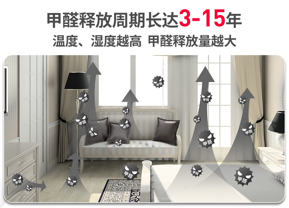 甲醛的一個特性,決定了治理它遠(yuǎn)不是簡單的小事一件,可以說,如果甲醛是個人的話,人們一說除甲醛,甲醛就笑了。各類除甲醛產(chǎn)品、各式的除甲醛方法、除甲醛妙招,在甲醛面前各有各的力不從心。這個特性就是:第一,污染源釋放甲醛的時間非常長,長達(dá)3~15年;第二,甲醛喜仗高溫、高濕之勢,就像山火借了夏風(fēng)的勢,一發(fā)不可收拾,新房在前幾年,每年都會反復(fù)多次籠罩在中重度超標(biāo)的甲醛之中。
