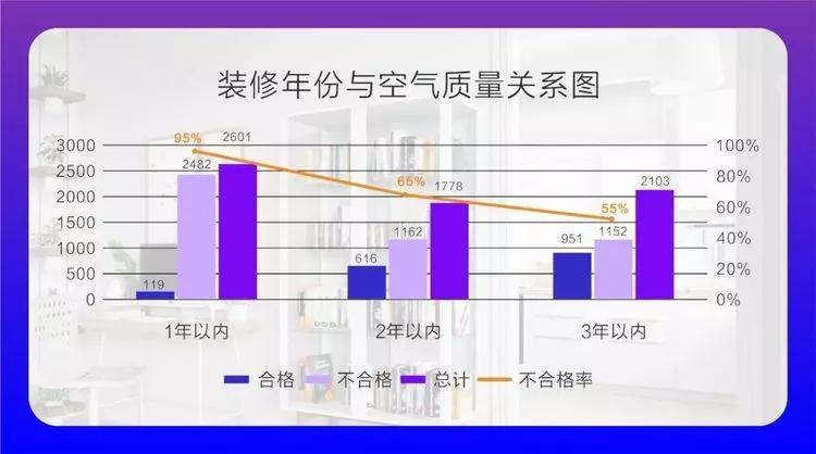 室內(nèi)空氣污染程度隨著裝修完成年份的增長而降低,其中裝修1年內(nèi)房屋不合格率為95%,裝修2年內(nèi)不合格率為65%,裝修3年內(nèi)不合格率為55%。